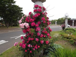 天王グリーンランド入口のセンターサークル内では、様々なつるバラの花が開花しています。