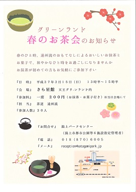 3月15日(日)13:30~15:30 天王グリーンランド内 きら★星館にて春のお茶会を開催いたします。