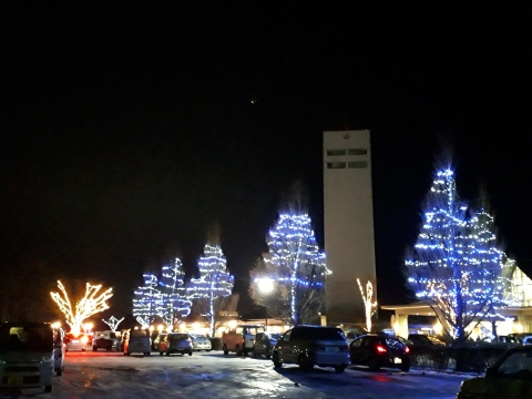 潟上パークセンターからのお知らせです。告知がだいぶ遅れてしまいましたが、天王グリーンランドではイルミネーションが点灯中です。今年は、約5万個のLED電球で点灯し、来年の1月いっぱいまでです。また、職員手作りによる大型クリスマスリースを食菜館入口に展示しています。是非、ご覧下さい。