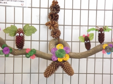 潟上パークセンターからのおしらせです。天王グリーンランド内大型トイレの飾り付けを模様替えしました。ワイヤーで作ったお花と松ぼっくりを枝にちりばめ、春らしく作ってみました。当スタッフによる手作り作品です。是非トイレをご利用の際はご覧になって下さい!!